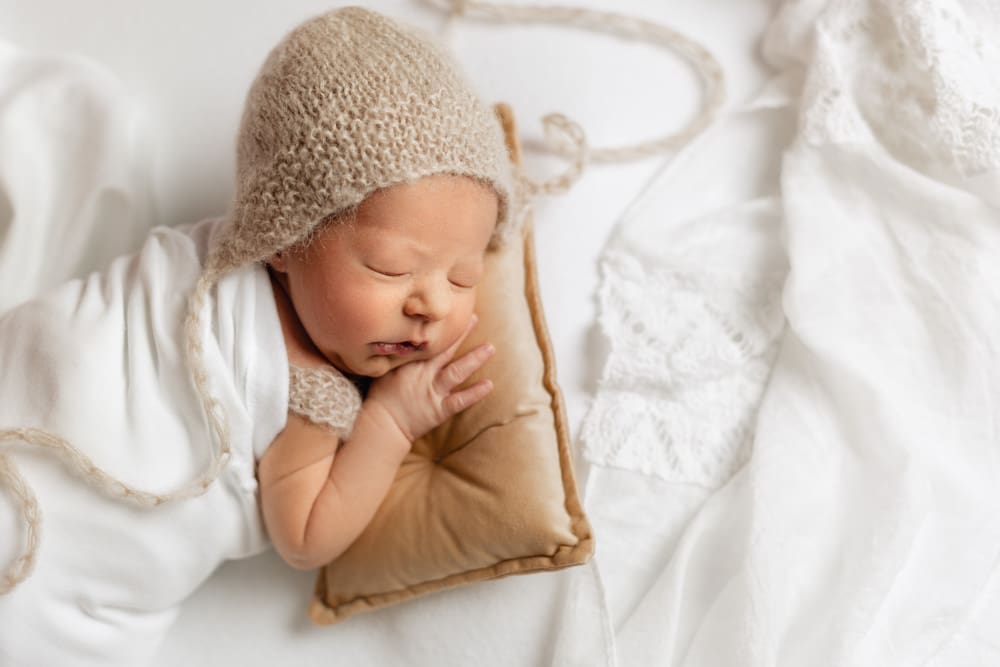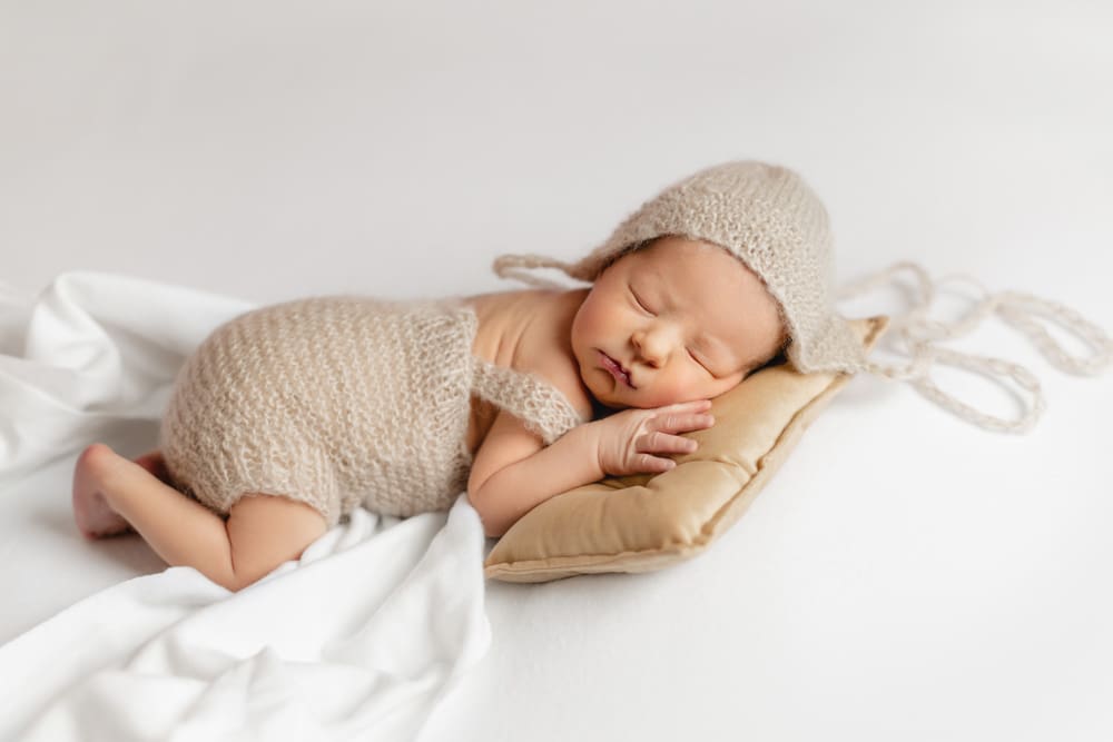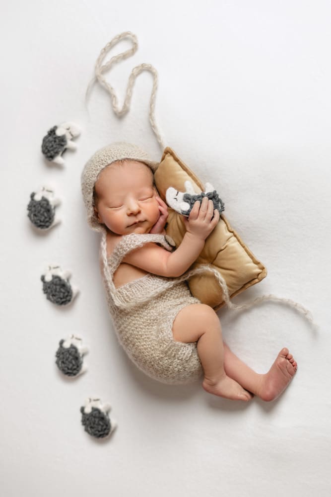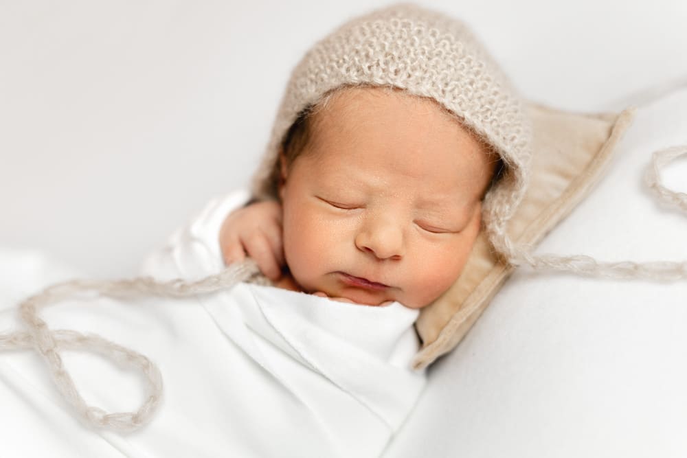 Ce type d’images épurées et blanches se fait avec douceur en prenant tout le temps nécessaire. Le plus souvent, votre petit sera en couche, body, ou petite tenue en maille. J’apporte un coussin spécial pour poser bébé, les couvertures blanches / écrues, de quoi l’emmailloter, et lorsqu’il dormira je pourrai le placer dans ces positions typiques du nourrisson.